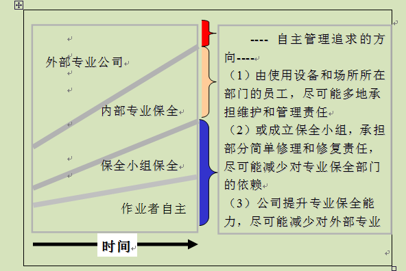 图2-2是某世界500强生产企业自主管理活动的规划示意图。其目的是通过鼓励一线作业者自主参与、构建部门保全小组、提高公司内部专业保全能力等一系列活动,不断减少对外部专业保全公司的依赖。