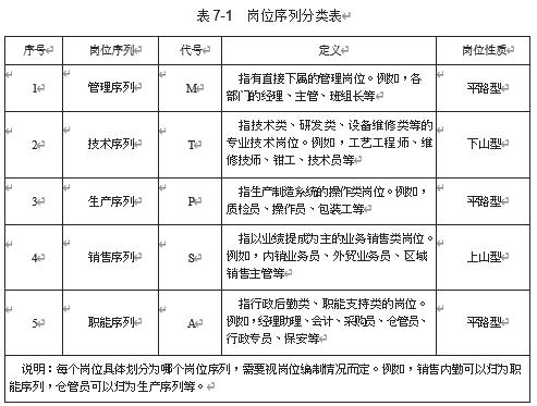 我所做过咨询的中小民营企业通常把岗位分为五个序列。具体见岗位序列分类表,如表 7-1 所示。
