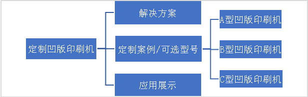 这也就是说,一方面,即使我们的产品看起来很简单、很单一,我们也要尽可能挖掘出它背后的所有相关问题和有效数据,比如工艺过程、原材料类型、市场应用等;另一方面,无论你设计了多少栏目、多少内容,它们最终都应该高度聚焦,指向同一个核心。至于这个“核心”具体应该是什么,这是在第一步“设计营销思路”时就需要思考并确定下来的内容。比如一个做印刷设备的工厂,其广告架构的焦点可以是“定制凹版印刷机”,“卷对卷印刷解决方案”,或者“各类印刷设备和耗材的一站式采购”。即使你卖的产品并没有任何区别,但当你选择了不同的焦点,为了贯彻它,你接下来要设计和展示的内容就是截然不同的。下面演示两个简化的框架设计作为例子,帮助大家更加直观地理解。