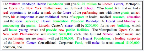 然后以一定的概率选取上述某个主题,再以一定的概率选取那个主题下的某个单词,不断地重复这两步,最终生成如下图所示的一篇文章。(其中不同颜色的词语分别对应上图中不同主题下的词)如图5–4所示。