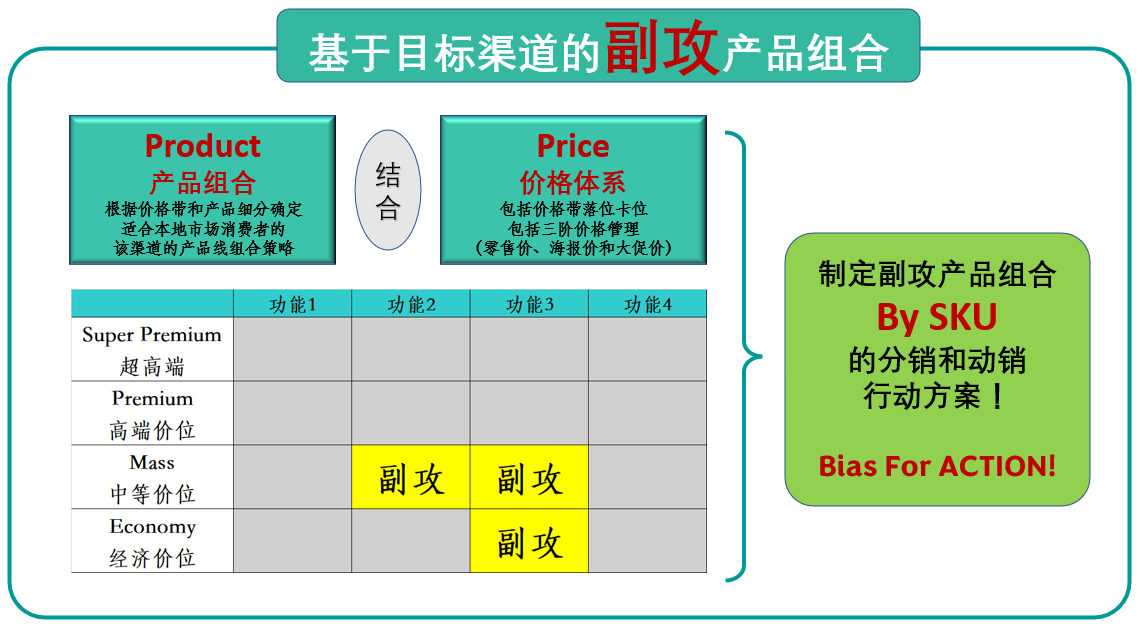 “主攻”战术类型:根据该品类细分的价格带和功效带来设定符合这个细分的产品组合,而这个产品组合尽可能是公司的主打核心品、畅销品,由此作为该渠道的主攻产品组合。