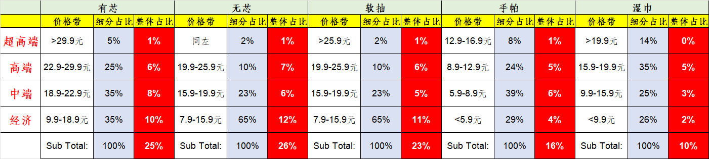 “举一个实际案例!一家头部生活用纸品牌的本地销售办事处要制定重点渠道的选品计划,希望在目标市场的大卖场渠道寻求业绩突破。作为一个市场容量相对有限的县城市场,该县城市场的大卖场渠道其实就是本地的老牌大超市——合家欢。当地销售为合家欢超市做选品计划的功效细分梳理时,他们直接用了合家欢采购常用的五大分类,即有芯、无芯、软抽、手帕和湿巾。同时在做价格带分析时,他们更是将有芯、无芯、软抽、手帕和湿巾的五个分类分别做了多层级价格带的分别设定。请看表4-4。”