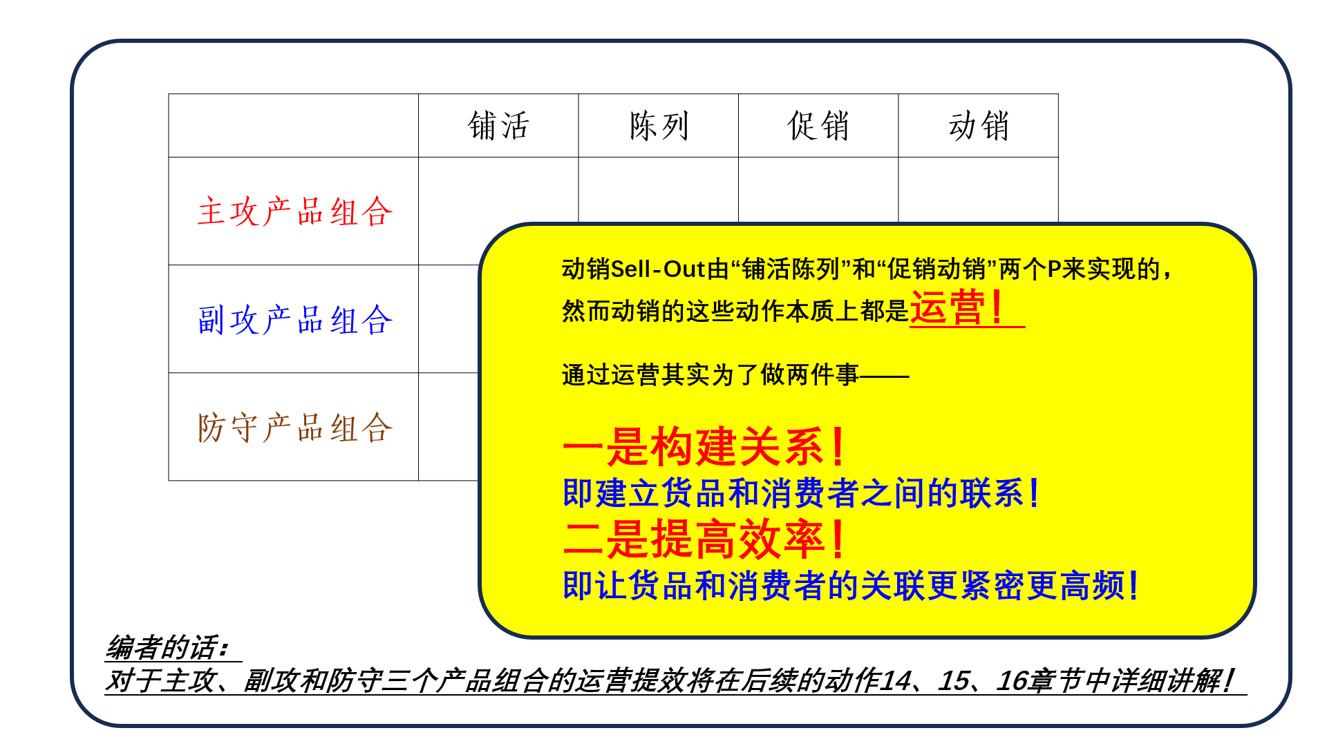 后文将有专门段落篇幅来分析和解读“如何提升运营能力和运营效率”,从主攻、副攻和防守三个策略产品组合的角度来切入,如果急需了解也可直接翻到后续的“动作14”、“动作15”和“动作16”段落。