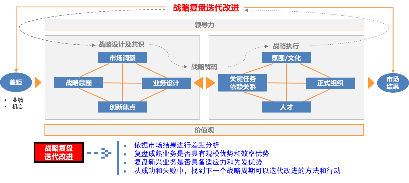使上述三个问题进行闭环管理的最好方法是战略复盘迭代改进。所谓战略复盘,是对上一个战略从规划到执行的完整周期进行回顾,总结得失和经验教训,更准确地理解事物发展规律。所谓迭代改进,是根据战略复盘的成果,重新优化、调整、改变从战略到执行的各模块内容,包括差距分析、战略设计及共识、战略解码、战略执行、领导力及价值观等,以便下一个战略从设计到执行周期内,更高质量地实现组织目标,如图7-1所示。