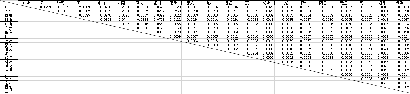 从珠三角城市群经济联系强度图可以看出,广州和佛山(2.1309)联系最为密切,其次广州和东莞(0.2861)、深圳和东莞(0.2034),广州和深圳(0.1429)等城市联系较为密切。