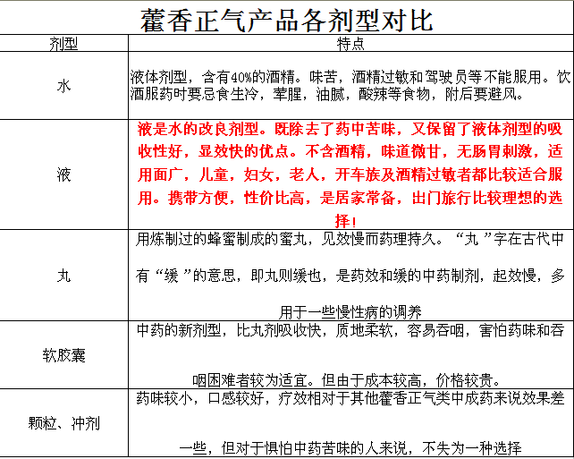 表22-1藿香正气产品各剂型对比