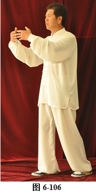 接上式,腰微拱,重心渐渐移至左腿,右手随重心转移向左下腹划弧捋至左肋旁。手心翻转向上,左手随腰拱,向外上方划弧翻转掌心向下,高与肩平,成左抱球状。右腰上提,右脚随即向前迈出小半步,右手臂上翻向前打掤(见图6-100至6-107)。