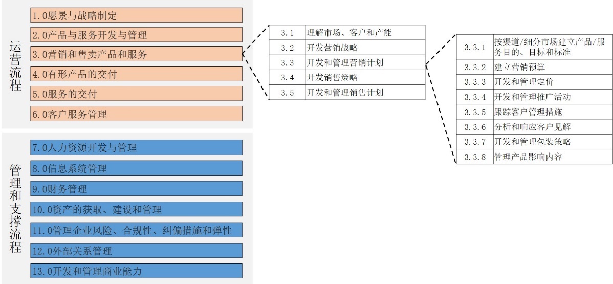 从1992年发布的流程分类框架(PCF)1.0版本,到最新的7.3.1版本(2023年),美国生产力与质量中心(APQC)在流程分类框架上沉淀的时间不可谓不久吧。于此同时,它还覆盖了19个行业,包括:航天国防、航空、汽车、银行、广播、市政、消费电子、消费产品、零售等,行业的积累也不可谓不多吧。这些流程分类框架(PCF)是基于国外一些领先企业的管理总结而来的,在对标的时候需要了解管理的理念、文化的差距,这对公司来说也是很关键的。其分类框架的展示示例如下: