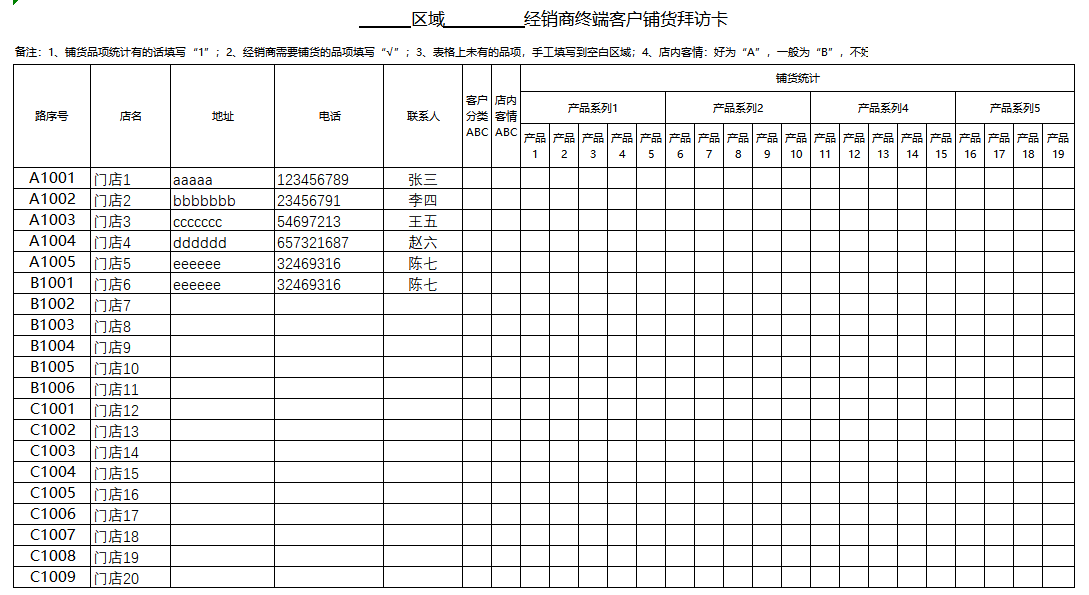 铺货拜访卡上清晰的写着哪个产品在哪家店里存在着,哪些产品没有。门店的客情等级很清晰的表明了难易度。