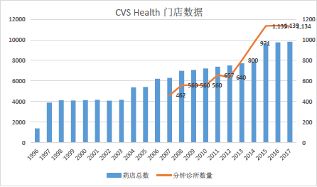 ①从1996年开始,CVS Health旗下连锁药店门店数量由1400家增长至9900家,新增8500家,平均每年新增400家左右;