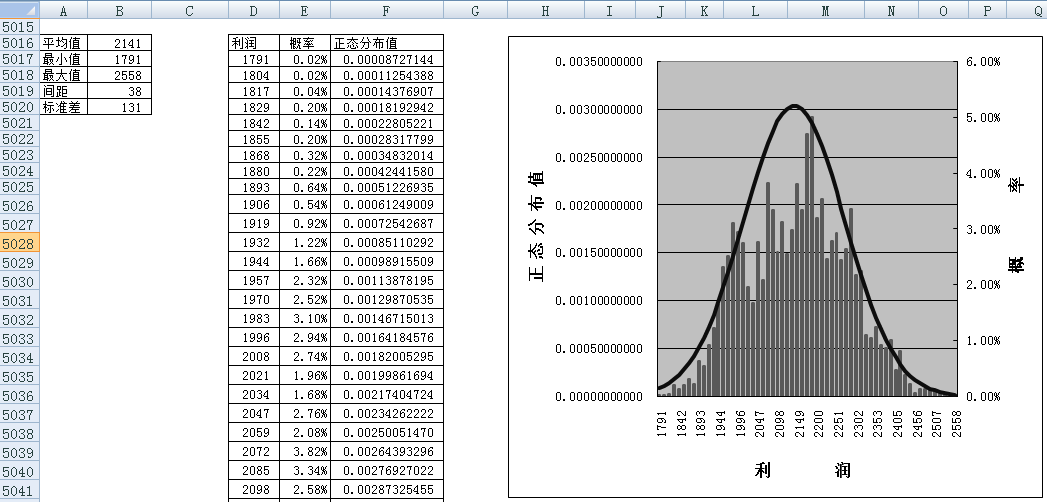 选择D5016:F5077区域,可生成利润点区间概率和正态模拟图形。