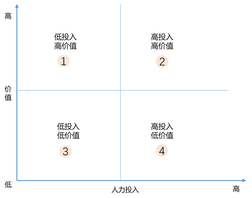 此矩阵是一个横轴为人力投入、纵轴为价值的散点图,分为四个象限,以便按优先级对内容归类。如图8-25所示。