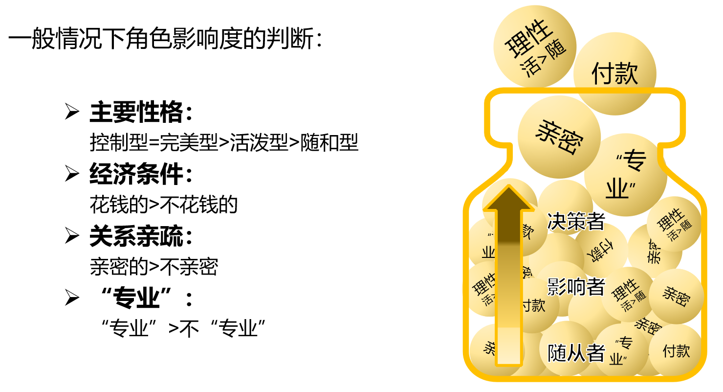 我们都知道,不同关系的人员之间的亲疏程度不同,关心程度也不一样,越是亲密的人越愿意主导决策。比如夫妻关系,丈夫非常关心妻子,对其治疗过程中产生的疼痛或者治疗后的效果等非常关注,同时他还可能是购买者,二者相加就很可能使其成为决策者,此时就成为我们的主攻对象。