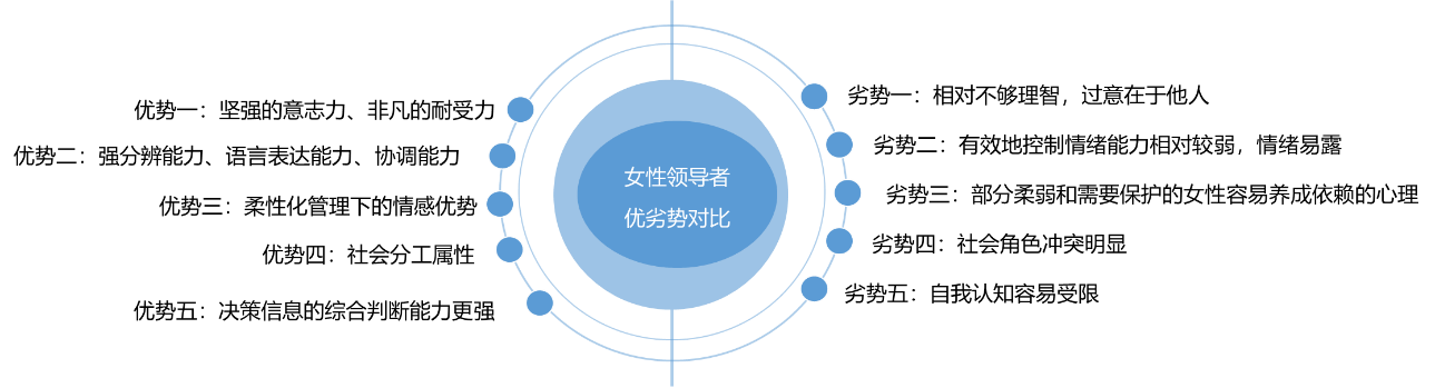 优势五:女性领导者还具有基于心理、生理特点的知识优势,知觉速度优于男性、机械记忆能力强、形象逻辑能力较强、知识结构立体性、交叉性、综合性也更优,对于决策信息的综合判断能力更强。
