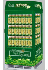 特点:四面是玻璃,产品展示效果好,顶端有灯箱,广告效果好,搁板上下高度可调,前后门设计,拿取饮品更便捷,适合单一品牌投放。
