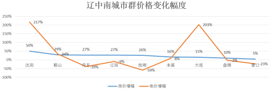 辽中南城市群房价平均涨幅为23%,地价平均涨幅为37%。房价涨幅高于城市群整体平均增幅的城市共有5个,分别为沈阳、鞍山、丹东、辽阳、抚顺;地价涨幅高于城市群整体平均增幅的城市共有2个,分别为沈阳、大连。