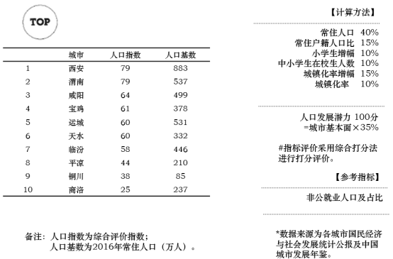 关中城市群10个城市人口基数均值为413万人。人口指数TOP3城市为:西安、渭南、咸阳。