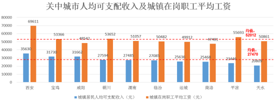 城市群人均城镇居民可支配收入均值为27470元,低于全国人均城镇居民可支配收入33616元;城市群中有5个城市高于城市群均值,分别为西安、宝鸡、咸阳、铜川、渭南。城市群城镇在岗职工平均工资的均值为52012元,超过均值的城市共有4个,分别为西安、宝鸡、铜川、平凉。