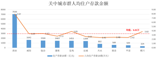 关中城市群整体人均住户存款余额为3.25万元,高于整体水平的城市有5个,分别为西安、咸阳、临汾、宝鸡、铜川。