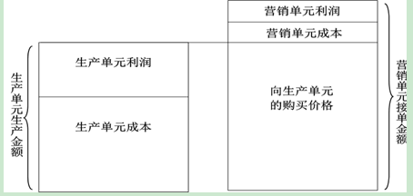对于那些面向一般消费者的产品,则采用分配方式B,由营销部门承担更大的价格风险。对于生产部门来说,营销人员以事先约定的价格购买生产单元的产品,而购买金额的总额便是生产模块的收入。生产模块的利润便是购买金额减去生产单元的成本。对于营销模块来说,利润便是与客户协商的接单金额,扣除付给生产单元的购买金额,再扣除营销单元的成本。分配方式B如图6-5所示: