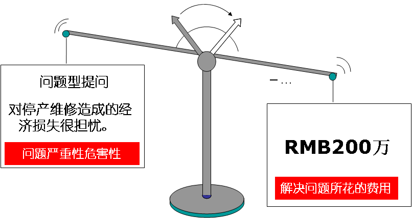 点评:销售顾问不但指出了客户使用现有的窑炉维修方法在生产高峰时会带来麻烦,同时也提醒客户这些麻烦的后果:窑炉停产一天企业就要损失××万元;客户合同无法履行的经济赔偿;重要客户流失;企业信誉受损;员工待工成本等。当停产维修造成的经济损失大大超过解决问题所花的费用,客户就不会产生异议,同时,“可以避免企业由于窑炉停产带来的经济损失”,这是由客户自己陈述的,因此客户产生价格异议的可能性就大大降低了(见价值天平图2)。