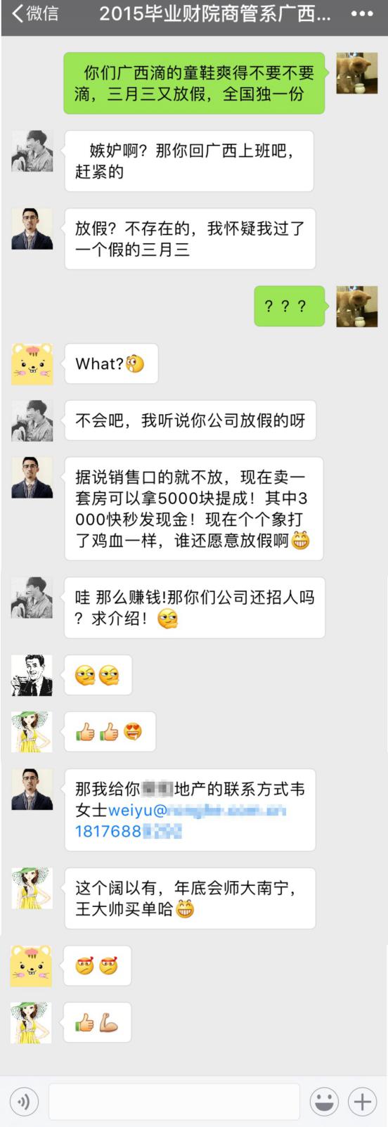 这种技巧也可以称之为“返璞归真法”,即制造或嫁接一个生活中的“实际”场景,巧妙地植入广告信息,植入得越自然越好,不留太明显的人工雕琢或设计的痕迹。这也是微商惯用的伎俩,我们常见的有:体现产品销售火爆的对话场景、体现产品试用效果明显需要复购且一货难求的对话场景、患者寻医问药(或询问减肥方法)专家答疑解惑并提供建议的对话场景、下乡解决农产品滞销问题的公益性扶持助销场景等。这种形式常常用于微信群推广、朋友圈推广、大V平台推广等渠道。接下来以一个“微信交流群对话式招聘广告”,分析场景嫁接微海报的晒图生成技(见图5-15)。