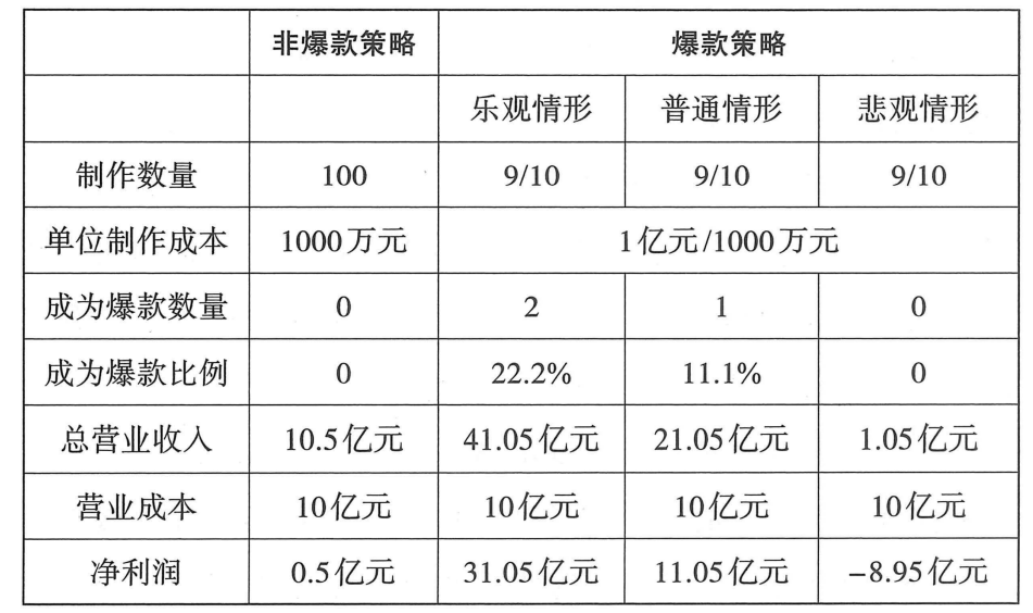 非爆款策略下预期净利是5000万,而爆款策略乐观情况下,净利润是31.05亿,普通情形下净利润为11.05亿,仅在悲观情形下净利润为-8.95亿, 如果3种情况出现的概率相同,那爆款策略下预期净利润为11.05亿,远超过非爆款策略。