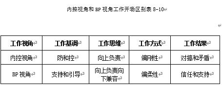 总结一下内控视角和BP视角下的工作基调、工作思维、工作方式和工作结果,如表8-10所示: