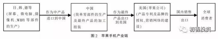 如图2-1所示,以这张富士康的苹果手机产业链为例,富士康作为一家中游的生产商,其上游是各个手机元器件供应商,下游是终端设备商苹果。同时,苹果兼具产品设计、品牌专利和渠道,此外苹果的下游还有各个分销渠道商,直到最终的消费者。