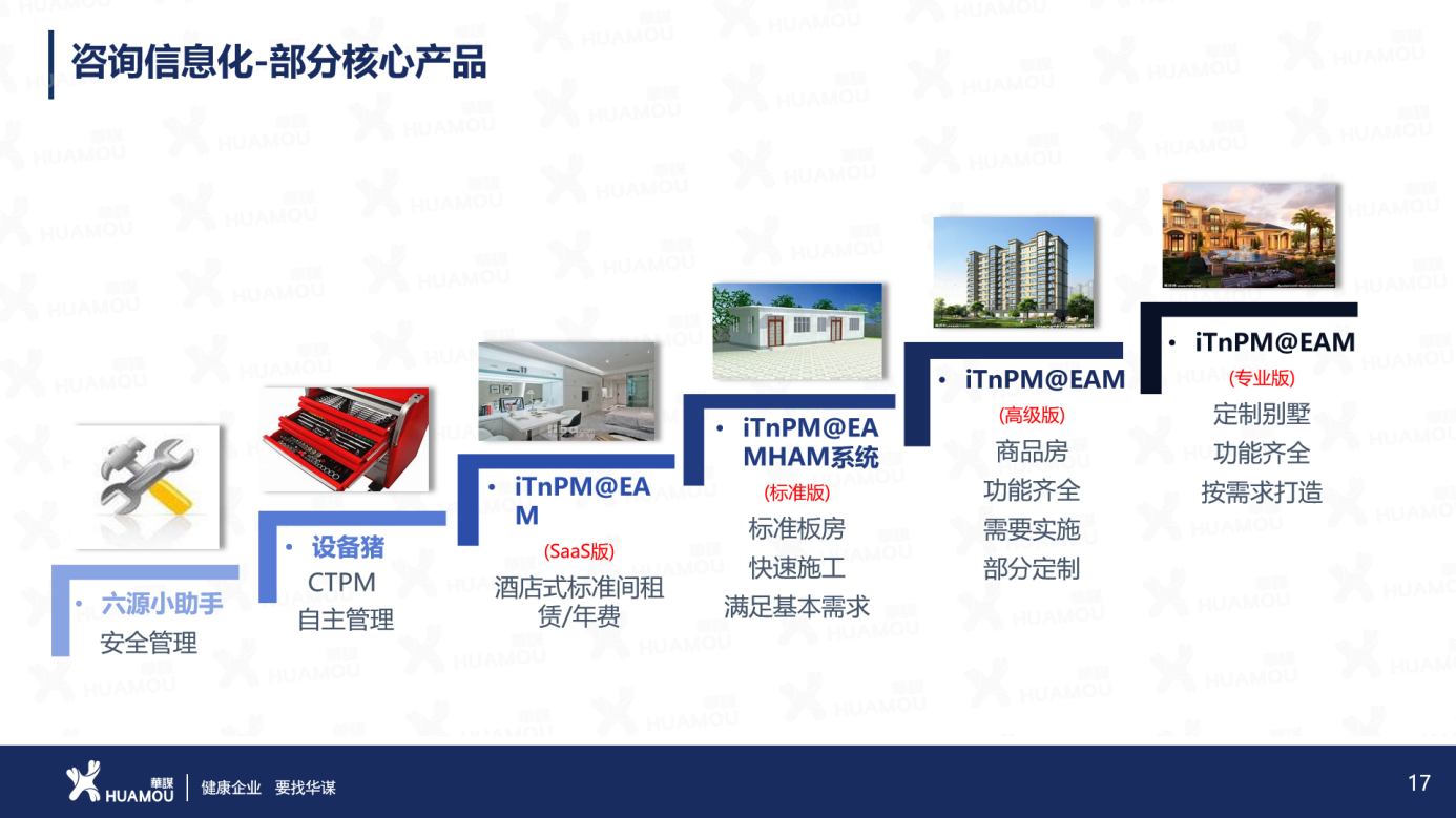 华谋咨询为客户提供管理咨询+信息一体化的专业服务,拥有原创的管理理论体系及经过数千家企业实践提炼的管理技术,形成十大咨询方向:基础管理增值系列、生产增值系列、供应增值系列、营销增值系列、人资增值系列、财务增值系列、研发增值系列、运营增值系列、战略增值系列、其他增值系列。华谋咨询股份服务领域涵盖全部十大行业:采矿与冶金行业、化工与原料行业、食品与包装行业、家居与休闲行业、电子与电器行业、机械与设备行业、交通与运输设备行业、能源与建筑行业、传统服务业、现代服务业;以研究非自然生命体发展周期的十个阶段为对象,为非自然生命体可持续健康发展、提供全方位一体化第三方技术服务。