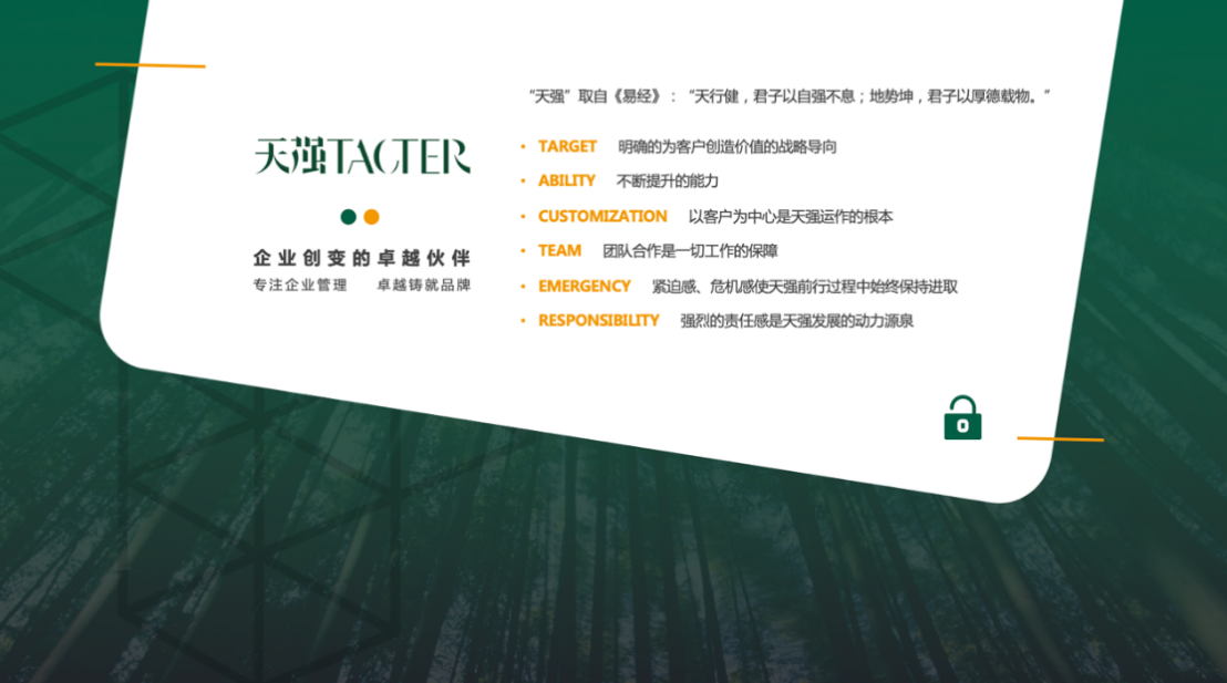 务实的企业文化。天强始终坚持“价值共创、纳新求变、伙伴共生、成人达己”的核心价值观,崇尚与客户、员工、合作伙伴的共生关系,坚持集成整合服务的理念,以开放平台整合生态链上的专业机构与资源,为客户解决问题,创造可感知的价值,为员工实现可预期的事业发展。