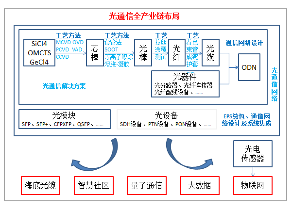 整体光通信方面,作为全球光纤通信前3强、中国光纤光网领域规模最大的系统集成商与网络服务商,亨通、大力布局量子通信、光纤感知及物联网技术、大数据与网络安全、智慧社区、新能源、海洋观测网等新兴产业、新兴领域,在光纤通信领域构筑形成了光纤通信和量子通信全产业链及自主核心技术,进军海洋工程、量子保密通信、大数据等高端产品及新领域,拓展新的战略空间,形成“产品+运营+服务”全价值链优势。