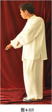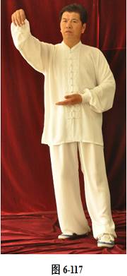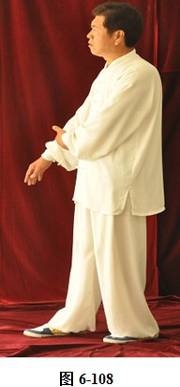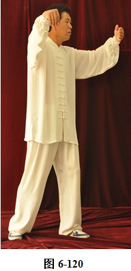 接上式,挤出后,右腰上提往左旋转,身体随向左转动,眼神也随之向左看。挤式不变,跟随身体也向左转至正南 向上方穿掌, 右脚也随之内稍转。腰微拱,穿掌的两臂顺势向下採,重心移至右腿成微后倚。腰向右外旋转,身体侧向西北,两臂也随之翻转向右后, 两掌指尖斜指向地面两掌心朝下。左手臂置于右小腹,右手臂置于右胯外侧舒伸直。左腰上提,左脚外开脚尖朝向正南,与左肩平行;右腰同时上提,带动两臂向上划弧摆向正南,成左弓步。腰向左外撑, 两臂随腰向左外划弧。腰随之后拱重心移至右腿,两臂继续向下划圆,左手向里旋转手心向上,随重心转移后坐收之腹前,两掌相对合在一起(见图6—108至6-122)。腰微含旋转向右,两手相合的双肘也随之微转稍斜向西北,打出右边肘;腰回转微含,随之上提,右臂顺势向右外上方打开,右掌变勾手向右上方平送,略高于右肩。左手仍置胸前,左腰微拱,向左外转,身体转向东南,随即提左膝,左脚向左前上方迈出一步,脚尖朝向东南, 右脚随左脚内转朝向东南。左腰继续上提,左臂随之向前掤出,成左弓步。腰微拱身体稍后坐,掤出左手顺势内旋翻,掌心向下採按至腹前。腰随即上提左掌顺势向左前上方推出。