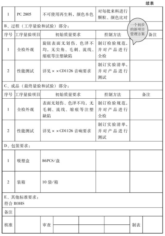 根据过程设想、质量目标、设计目标,制定初始的工艺流程图设想,这个设想一旦成型,工程部门就要准备制样的工装与设备。对初始流程图不做特别要求。参见表1-2-3。