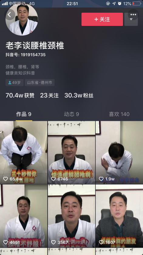 有一个账号叫作“老李谈腰椎颈椎”(图7-4),拍的是他亲戚,主要讲腰椎颈椎做哪些动作可以治疗。结果每个月有一两万人加微信,加了微信就卖99元的“狗皮膏药”,变现很容易。