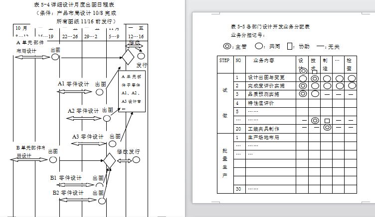 图5-7模式就是由项目组经理负责制定整体计划。整体计划包括设计开发大日程,即什么时间进行试做及试做多少台,试做每台的目的与用途,什么时间正式批量生产等。整体计划还包括新产品开发准备过程中各部门需要完成的业务内容(如表5-5),新产品开发准备过程中各项管理指标的目标值(如表5-1)。整体计划也包括设计开发项目管理的组织图,在设计开发项目组成立前,由公司要求各部门选定开发准备过程中自己部门的派遣成员。当然,在本章开始提到的“企划阶段决定的主要内容”,作为附件告知相关人员(注意,什么样资料传达到什么级别,公司应在资料上明确标注,以便保密)。各部门选定的参加设计开发项目组的成员,根据整体计划要求,代表本部门制定所在部门在新产品准备过程中实施的详细计划,再经过本部门经理审核后,提交项目开发组在协调会上进行协调沟通与审核。例如:
