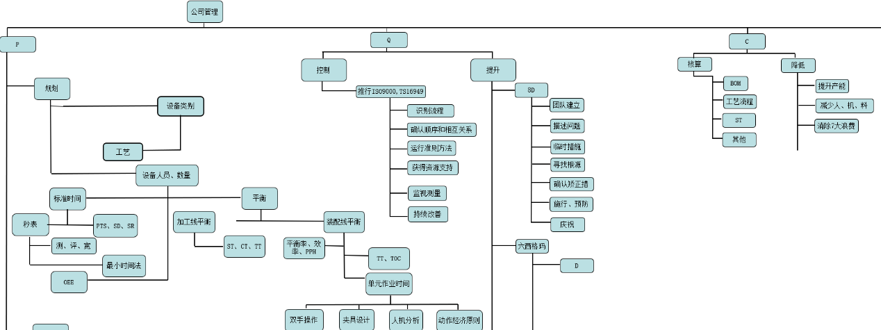 刚上班的时候,笔者已经有一些不满足每天去车间测测工时、做做平衡图这些事情了,需要转变,需要思考,需要重新出发。从这个时候起,开始每天完善自己的知识结构。当然当时还不会什么思维导图,就是通过Excel把自己知道的,应该去了解的内容制作成框架式的结构,然后慢慢去弥补这些内容。也是从这个时候开始接触一些比较有系统的知识,比如六西格玛,开始系统地去看书、去理解。甚至,在没事做的时候,把公司的组织结构依据电子通讯录上标识的部门进行绘制。有人可能会认为很傻,其实,不绘制不知道,绘制了才知道公司的组织架构这么庞大,因为公司是不会给一个IE提供组织架构的。