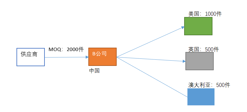 根据对未来三个月的需求预测,B公司先行安排订金,等A公司交付MOQ数量完毕后,再支付余下款项。B公司把MOQ按照相应预测数量,结合运输条件,运费等因素,分别计划从中国往美国,英国以及澳大利亚三个国家发送不同的数量。