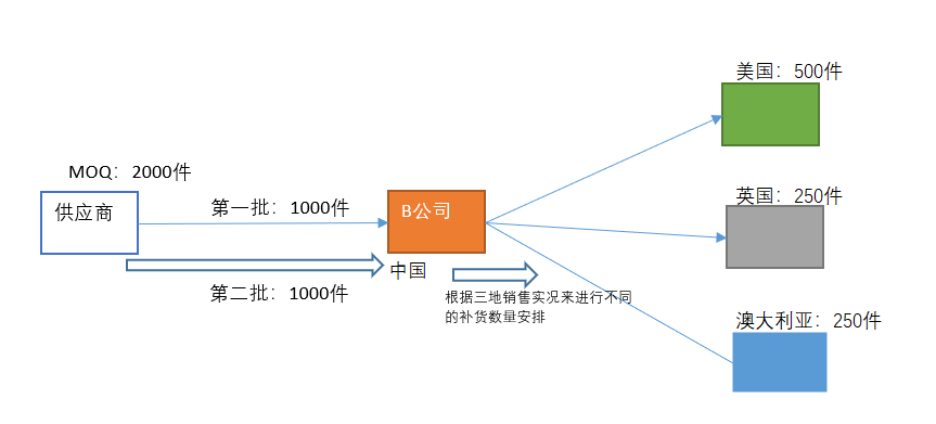 B公司9月1日向A公司下MOQ订单2000件,10月1日收到首批交付1000件,根据预测,运力,运费等各种因素向美国,英国和澳大利亚三个国家分别发送500件,250件,250件的数量,这三批于12月1日全部在当地完成收货,应对当地的销售需求。而第二批1000件A公司于11月1日实行交付,B公司则根据10月的销售情况结合三个国家各自的库存,再决定三地的补货数量,并安排11月甚至12月进行发送,同时监察运价的变动,选择一个适合的时间发送补货。