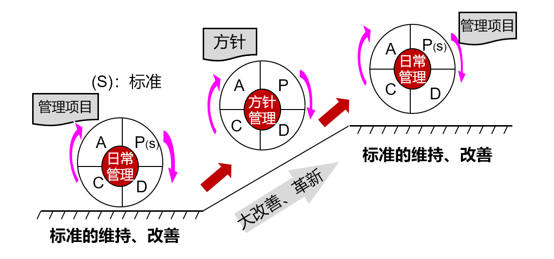 方针管理是因为生产过程中有需求,但之前没有做过的事情,用解决问题的方法,追求彻底地解决问题(防止再发),课题成果后要做成标准和流程,并横向展开,展开之后按照既定的标准进行执行就形成了日常管理。