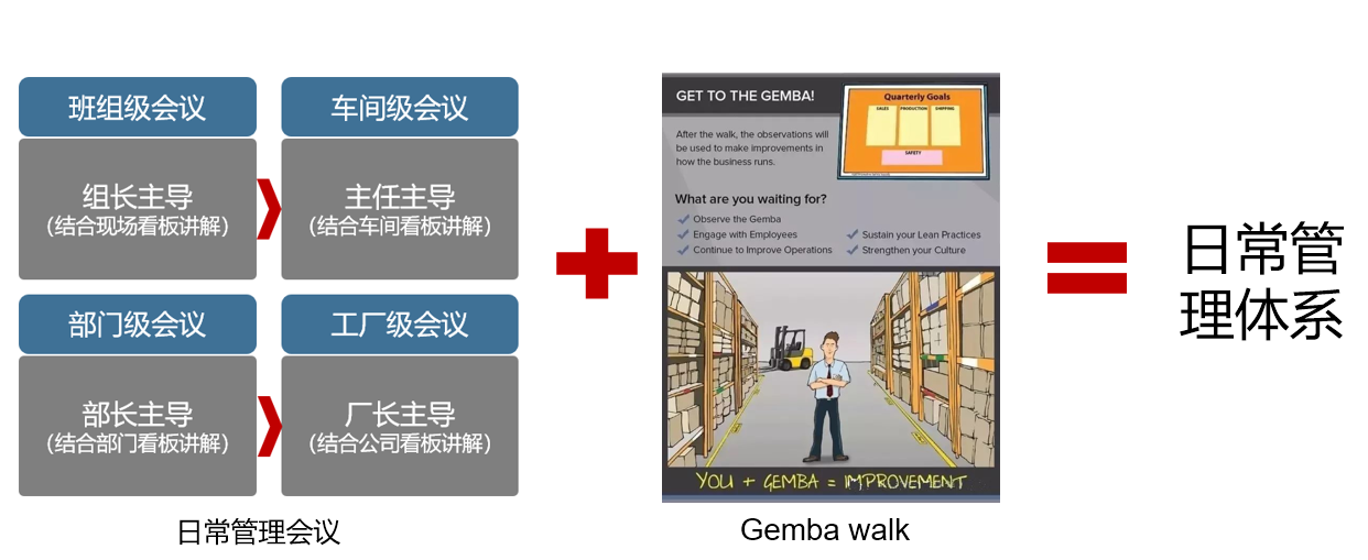 日常管理本身是一个工具,会议机制是承接这一工具的一个载体,通过不同层级的会议来达成日常管理中遇到的问题,进而回归到标准中去。为了使日常管理更加完善,就需要搭建一个日常管理体系。这个日常管理体系由日常管理会议和Gemba Walk组成。