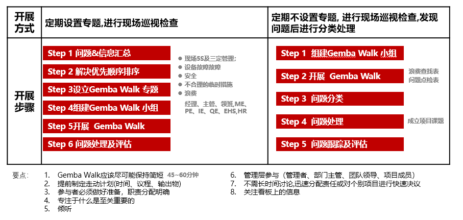 Gemba Walk开展的方式主要有两种:定期设置专题,进行现场巡视检查和定期不设置专题,进行现场巡视检查,发现问题后进行分类处理。