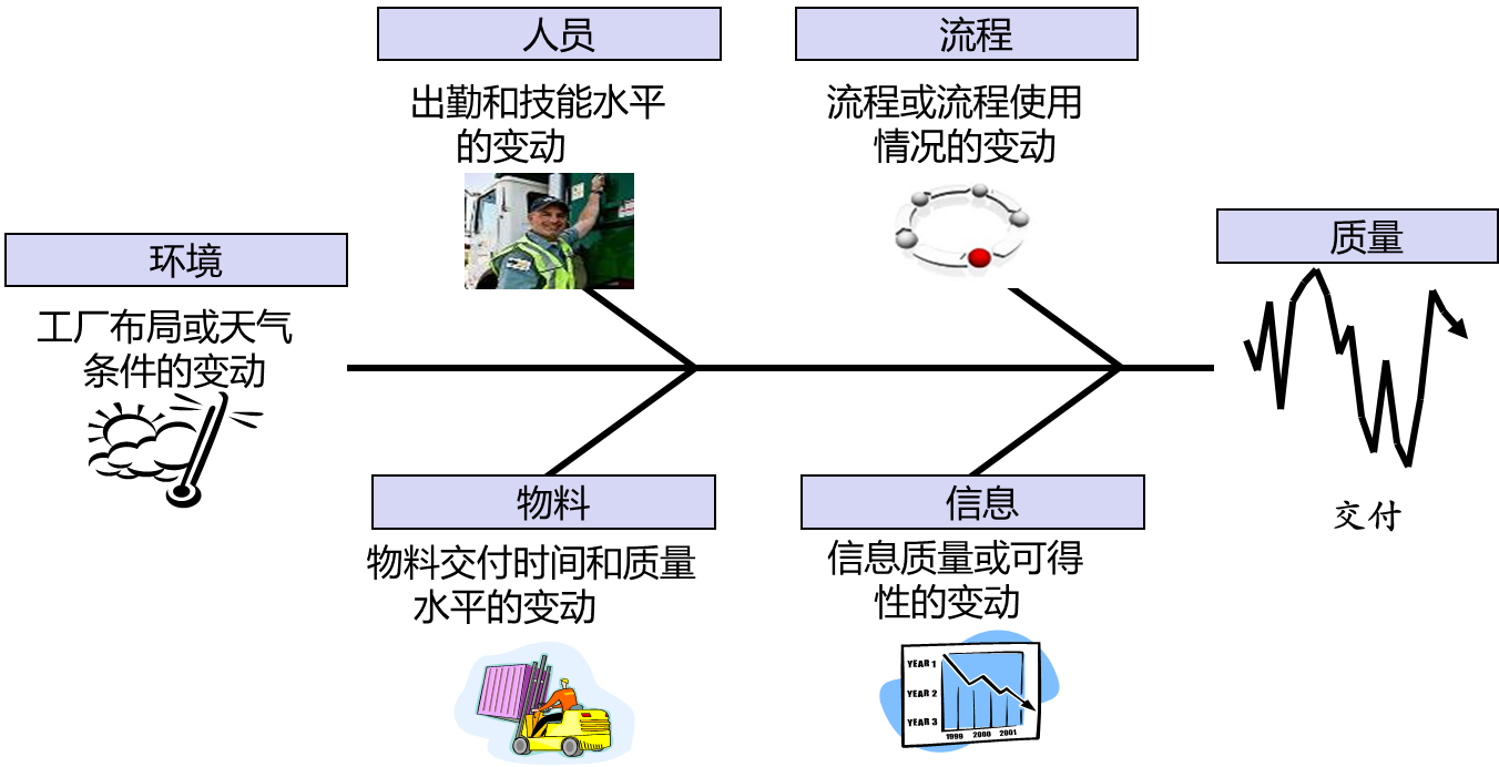 第二种损失:波动。波动是任何偏离标准的情形,会对交付给顾客的服务或产品的质量造成减损。就原料而言,变异会导致生产出有缺陷的零配件或设备故障;就技能而言,变异会导致生产力损失,或是流程发生瓶颈,因而延长产品交付周期。