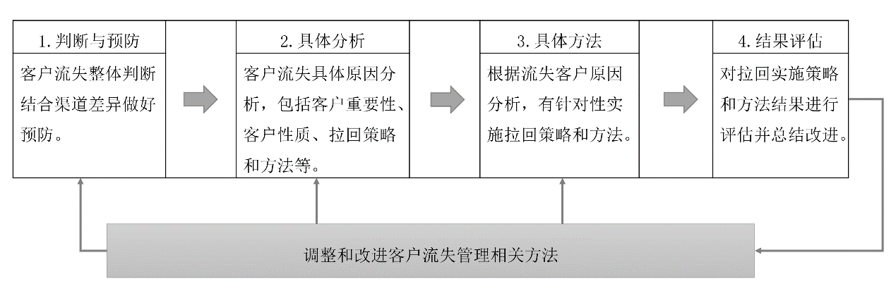 客户流失管理流程共有四个步骤,分别是:判断与预防、具体分析、具体方法和结果评估,具体内容详见图9-1。