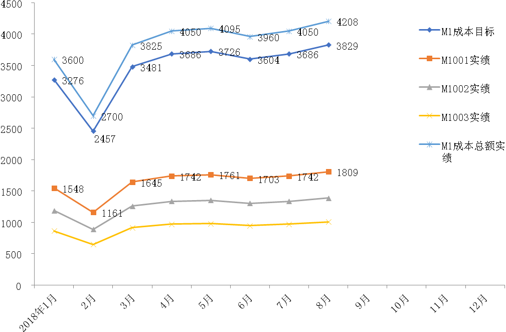 为了及时发现成本问题,需按成本科目进行专项监控。比如,期间为了重点监控M1科目的实绩表现,可参考图6.13将M1科目及构成M1科目的次级成本科目M1001~M1003一并纳入趋势图监控。