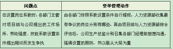 又比如,在设置岗位系数时,因为各部门主管都想为本部门的人员争取到更大的薪酬空间,便对项目组与公司提出的工作场所、劳动强度、技能系数设置条件提出疑问而发生争执,导致很长时间无法达成一致意见,阻碍了薪酬改革工作进度。这是在推行的过程中碰到的两个比较突出的问题。