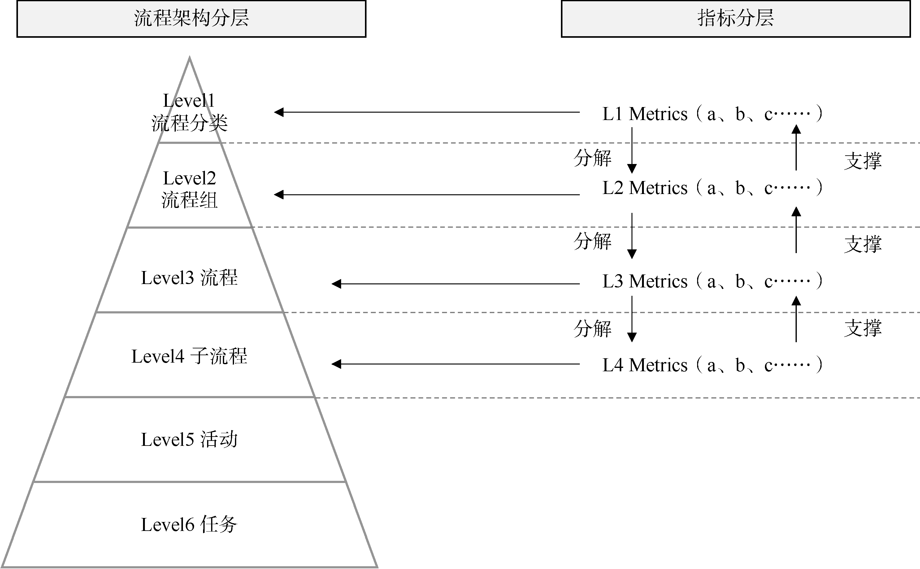 流程通过架构(L1~L6)自上而下层层分解,基于业务逻辑的层层分解,反映了业务运作的本质;流程绩效指标从流程中来,自然而然地形成了自上而下的逻辑关系,与流程架构的层级体系相契合,如图 2-19 所示。