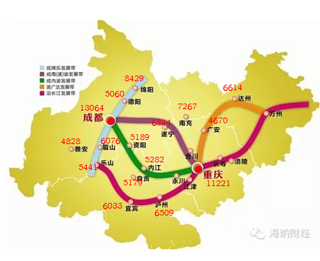 成渝城市群房价平均涨幅为53%,地价平均涨幅为133%。房价涨幅高于城市群整体平均增幅的城市共有7个,分别为重庆、成都、贵阳、绵阳、眉山、昆明及宜宾;地价涨幅高于城市群整体平均增幅的城市共有8个,分别为乐山、遂宁、达州、德阳、雅安、成都、贵阳及重庆。