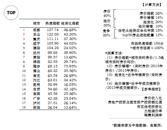 成渝城市群城市市场热度综合排名TOP3的城市为:成都、乐山及重庆。