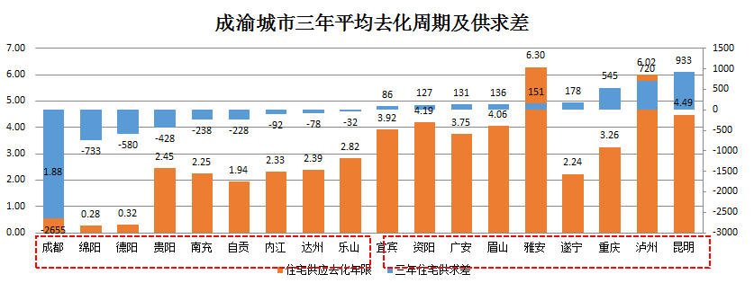 成渝城市群住宅供应去化年限为3.05年,去化周期小于3年的有10个。整体来看,成都、绵阳、德阳、贵阳、南充等城市市场供不应求;昆明、泸州、重庆、遂宁、雅安等城市市场供过于求。